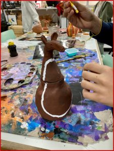 Foi um longo processo: modelar, desenhar o que foi modelado, desconstruir o que foi feito, modelar novamente, preparar a peça para receber as cores finais. Ao decorrer da investigação, fomos compreendendo que trabalhar com o barro requer um íntimo contato com o nosso entorno, os dias frios, úmidos, a temperatura das mãos, tudo influencia na textura da argila e nas etapas de secagem. Assim, as crianças produziram moringas com cabeça de bicho, inspiradas nas esculturas produzidas pelo artista Nei Xakriabá.